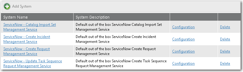After you have connected to ServiceNow, as described in Connecting App Broker with ServiceNow, two new web services will be listed on the ITSM Integration view named ServiceNow - Catalog Import Set Management Service and ServiceNow - Update Task Sequence Request Management Service .