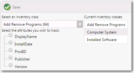 2. In the Select an inventory class list, select a new class, such as Add Remove Programs (64) . Attributes of that class are listed.