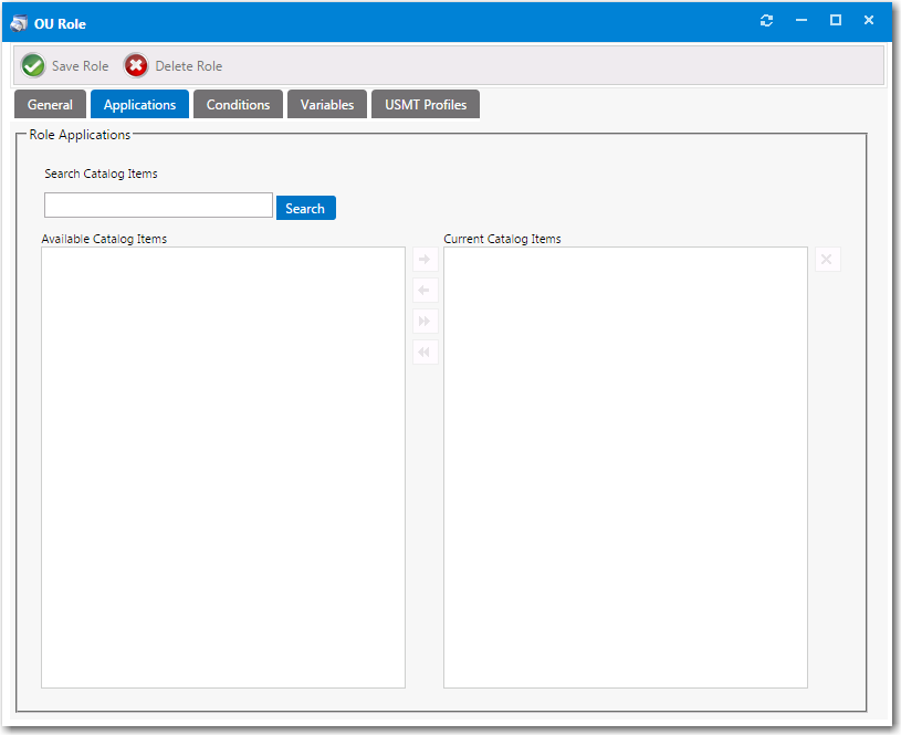 Use the Search Catalog Items box to locate catalog items to add to the role. Select a catalog item and then click the right arrow button to move it from the Available Catalog Items list to the Current Catalog Items list, adding the catalog item to the role.