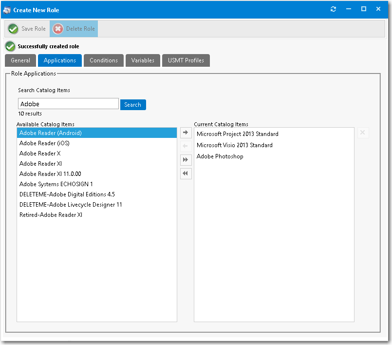 Click Save Role to create the new role. You will notice the following tabs become available for you to further configure the role properties: Conditions , Variables , and USMT Profiles .