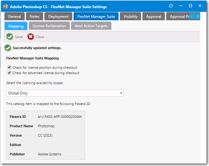 - Click Save . The catalog item is now mapped to a software entry in FlexNet Manager Suite, and the product information is now listed at the top of the dialog box.